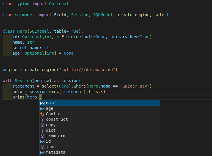 , etc. Your editor will be able to help you with everything because SQLModel is based on standard Python type annotations.